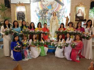 Sau lời nguyện hiệp lễ, là phần dâng hoa do các cô, các chị trong cộng đoàn VN dâng hoa kính Mẹ. Với những điệu vũ nhịp nhàng, cung kính, linh hoạt, pha lẫn với những tà áo dài cùng với những đóa hoa tươi muôn sắc trên tay, tiến dâng lên tòa Mẹ gói trọn tấm lòng kính mến, tạ ơn của đoàn con. Qua nghi thức dâng hoa thật ngoạn mục và đẹp mắt, cả cộng đoàn được chứng kiến màn dâng hoa mang sắc mầu Việt Nam thật sống động và sốt sắng, với trang phục áo dài, hòa cùng tiếng nhạc du dương, trầm bổng. Đoàn dâng hoa đã được cả nhà thờ vỗ tay tán thưởng.