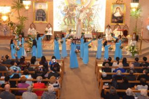 Mười bốn cô dâng hoa thướt tha trong màu áo dài thiên thanh, hai tay mỗi người cầm hai lọ hoa có nến cao cắm ở giữa, họ di chuyển nhịp nhàng theo tiếng đàn lời ca. Khi dàn hàng ngang thẳng tắp dưới chân Mẹ, hai tay nâng cao các lọ hoa đầy màu sắc, khi quỳ xuống theo hình Thánh giá, khi thì kết hợp thành vòng tròn, hai tay vẫn nhịp nhàng, uyển chuyển dâng lên Mẹ các đóa hồng đỏ, vàng, trắng, được kết hợp với cúc đại đóa vàng nhạt và cẩm chướng màu đỏ cam…