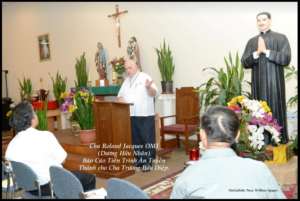 Hình ảnh cha Roland Jacques báo cáo về tiến trình phong thánh cho cha PX Trương Bửu Diệp.
